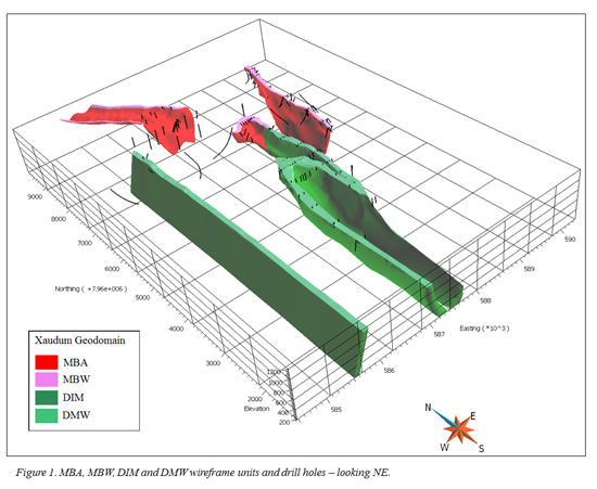 The geological modelling of Block 1 was carried out in-house by the company using Paradigm GOCAD geological modelling software, which was completed by geo-referencing interpreted cross sections into GOCAD and digitizing these sectional interpretations. These formed the basis of further interpretation and detailed geological modelling of wireframe surfaces of both mineralization and waste zones (geodomains).