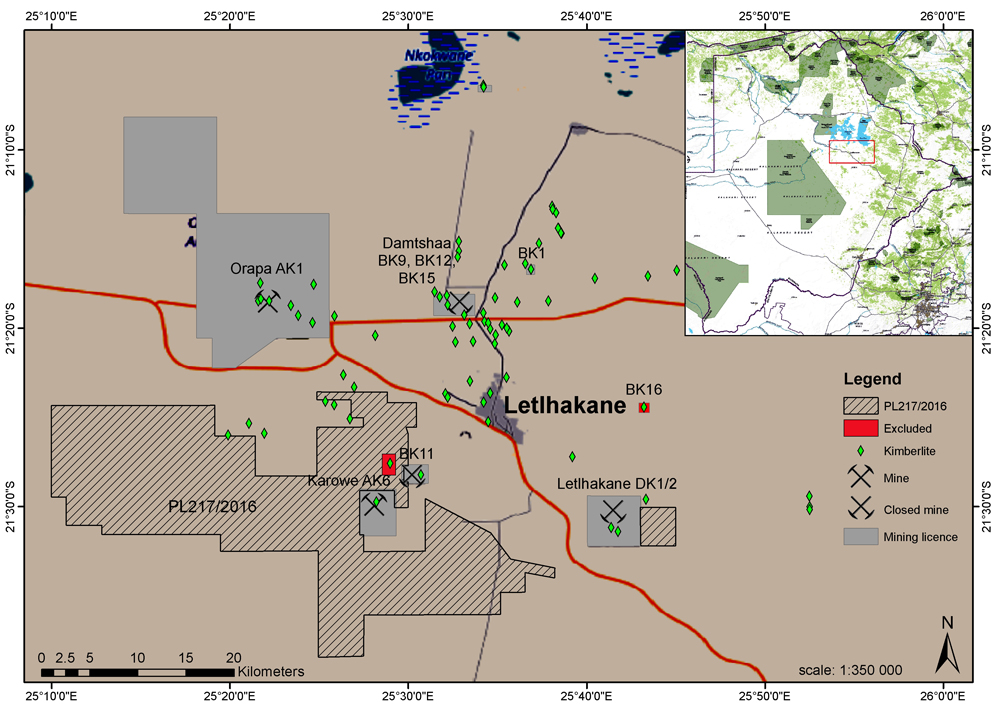 PL217/2016 is located within the OKF in Botswana. The diamond mines in Botswana have produced an average of 27 million carats annually in the last 10 years and Botswana is the world's largest producer of diamonds by value. In 2016, the OKF area produced 8.85 million carats. Of the 83 known kimberlite bodies in the OKF, eleven have been or are currently being mined. These are AK01 with AK02 and AK07 (Orapa, Debswana), AK06 (Karowe, Lucara Diamond Corporation), BK01, BK09, BK12 and BK15 (Damtshaa, Debswana), DK01 and DK02 (Letlhakane, Debswana) and BK11 (Firestone Diamonds). The Karowe mine has produced such notable diamonds as the 1,109 carat 'Lesedi La Rona' and the 813 carat 'Constellation'.
